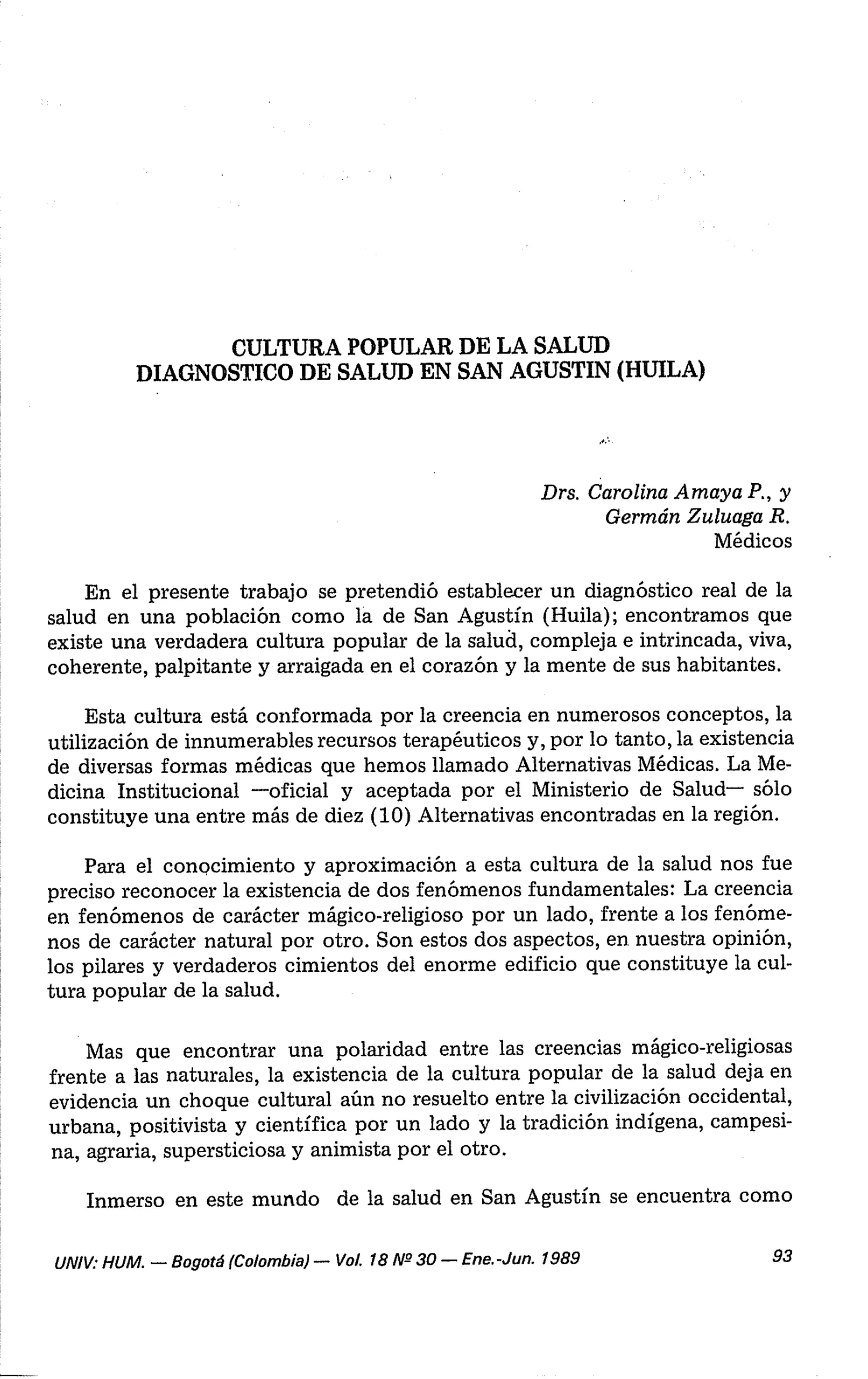 Cultura popular de la salud, diagnóstico de salud en San Agustín