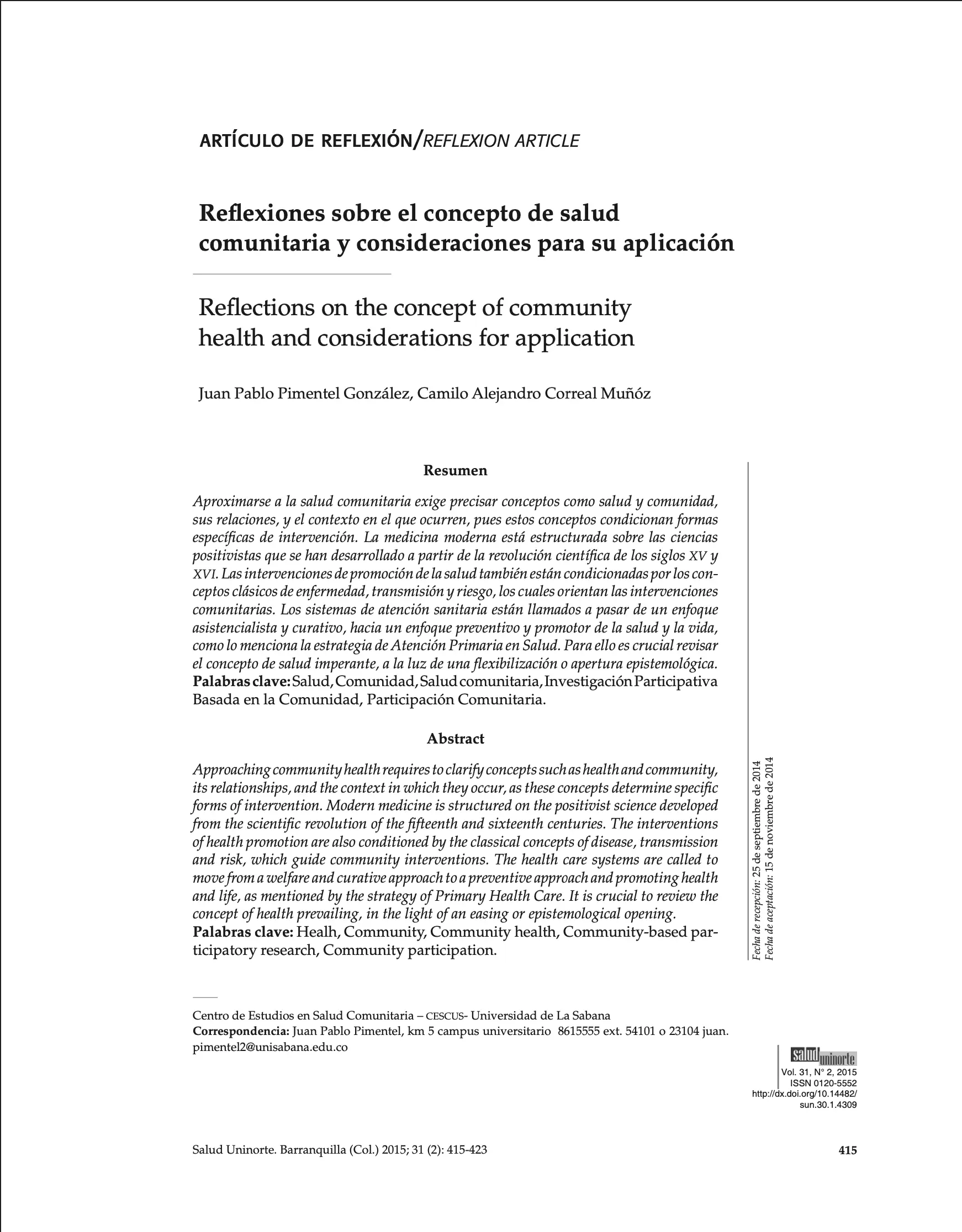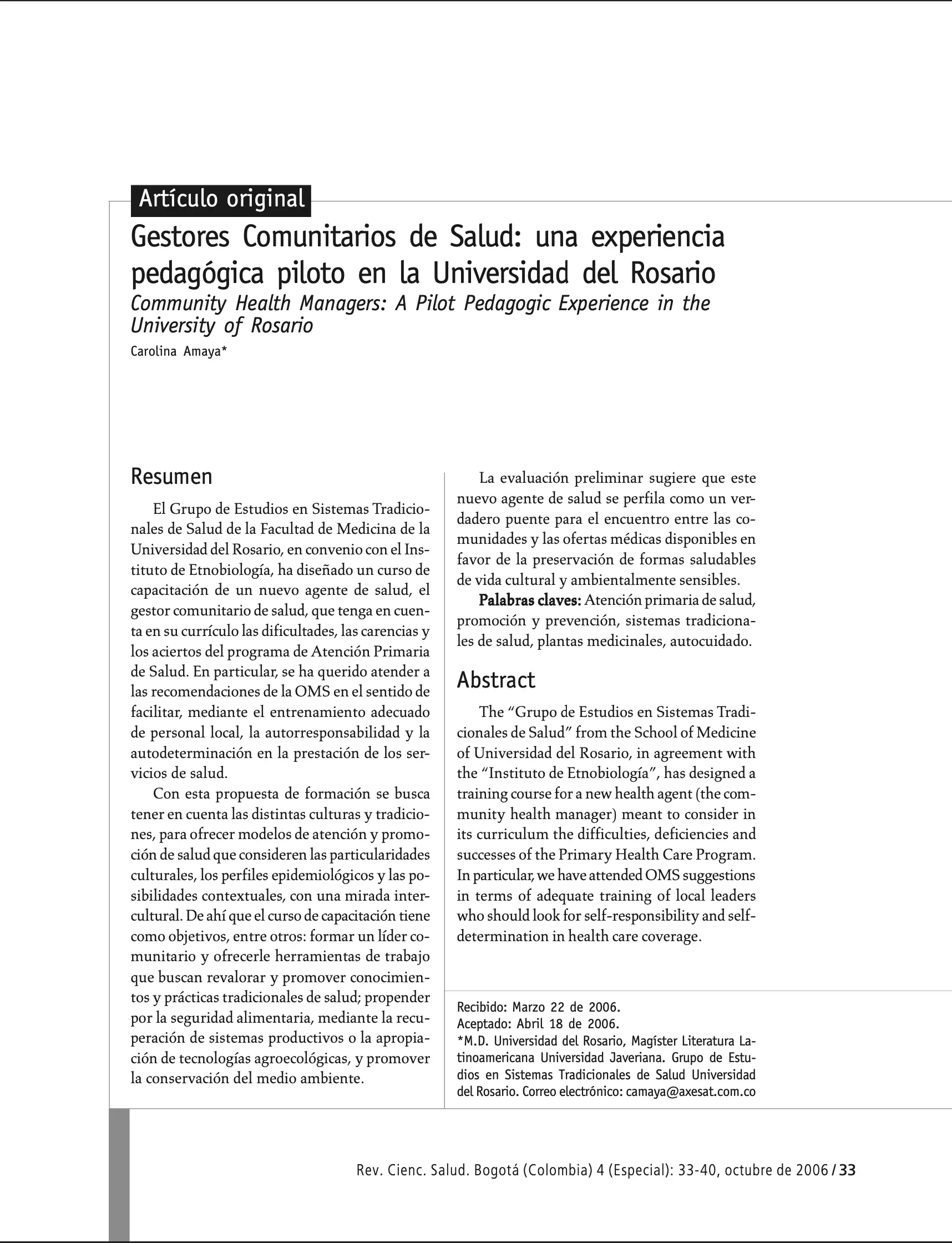 Gestores Comunitarios de Salud: una experiencia pedagógica piloto en la Universidad del Rosario