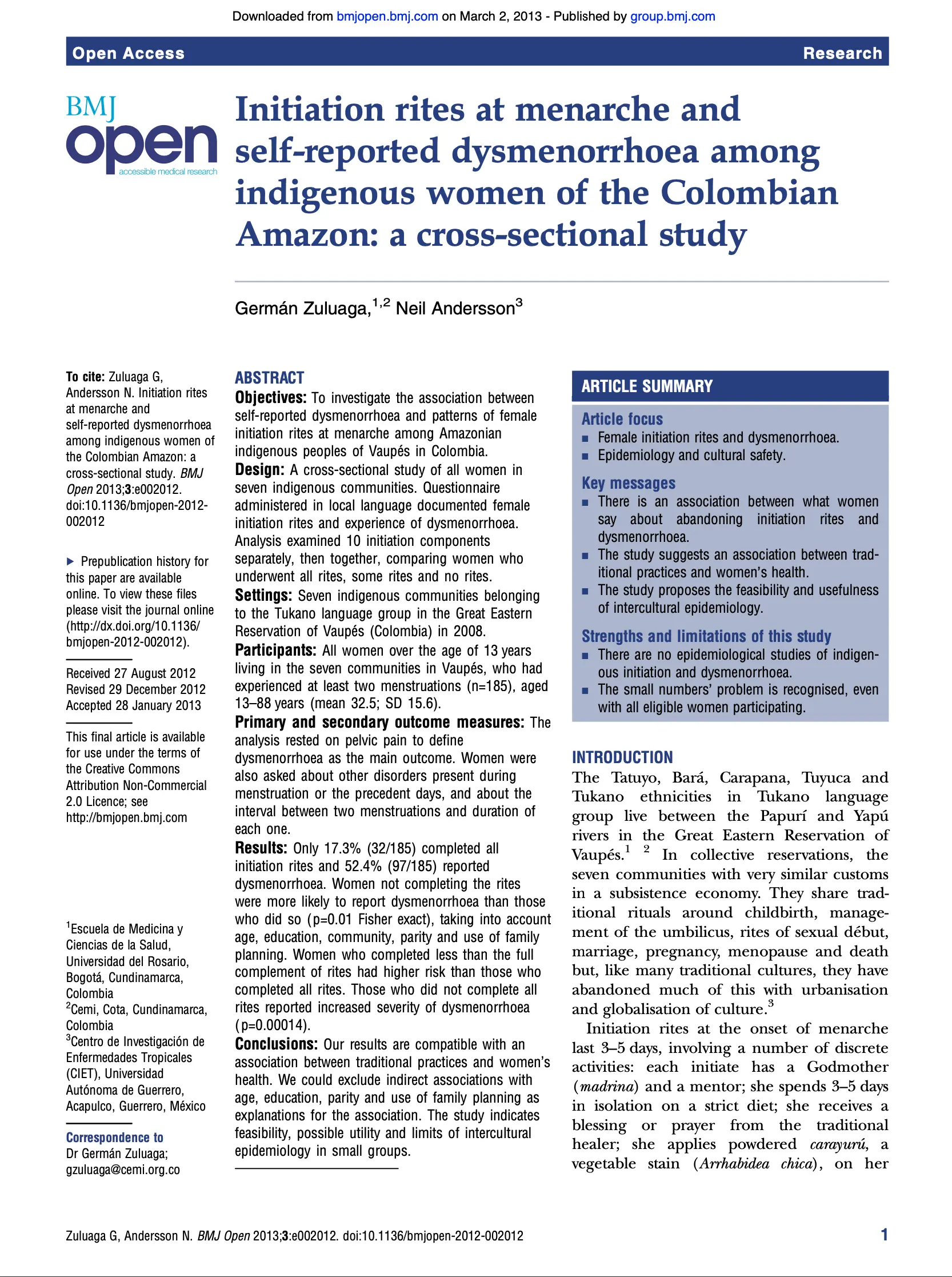 Initiation rites at menarche and self-reported dysmenorrhoea among indigenous women of the Colombian Amazon: a cross-sectional study