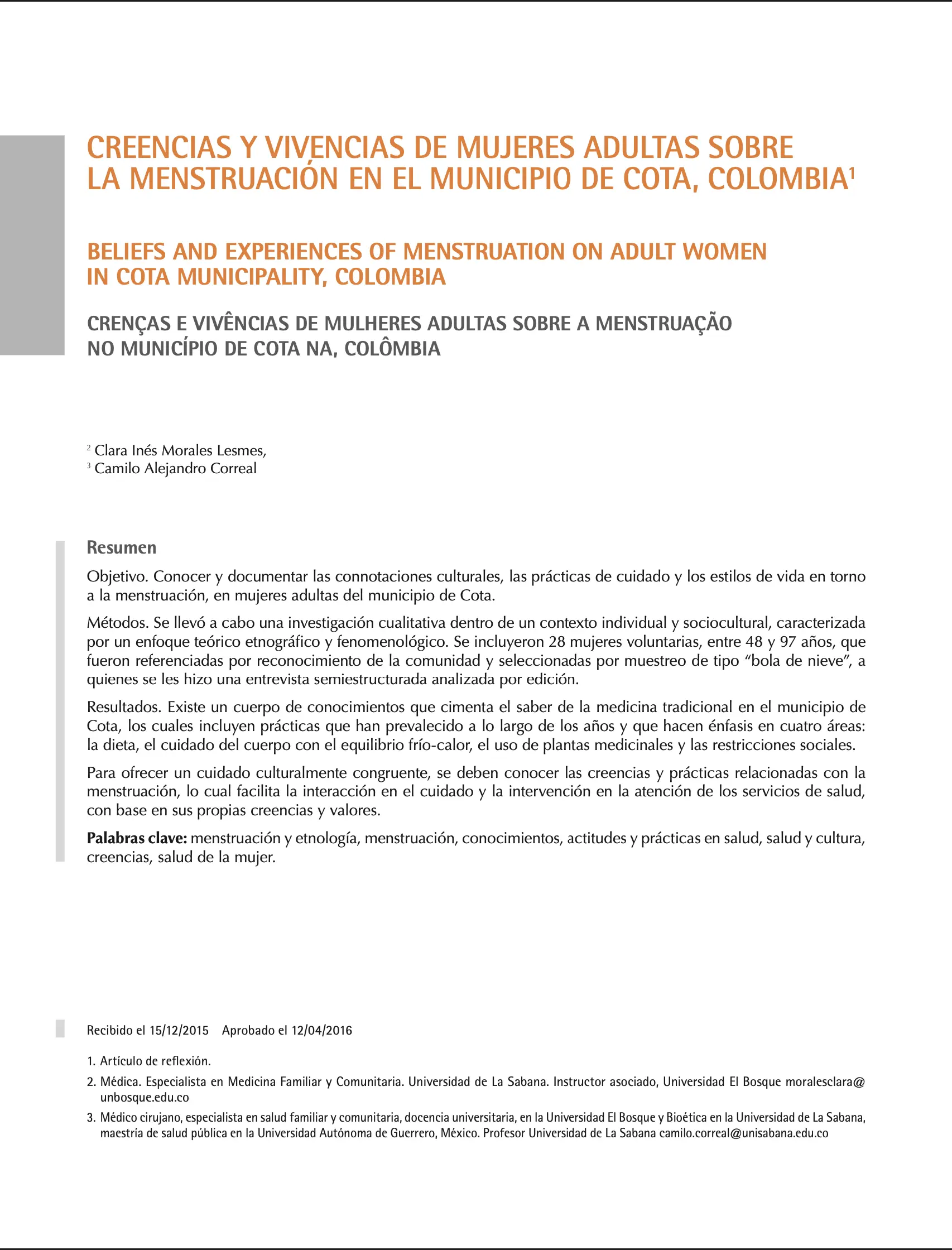Creencias y vivencias de mujeres adultas sobre la menstruación en el municipio de Cota, Colombia