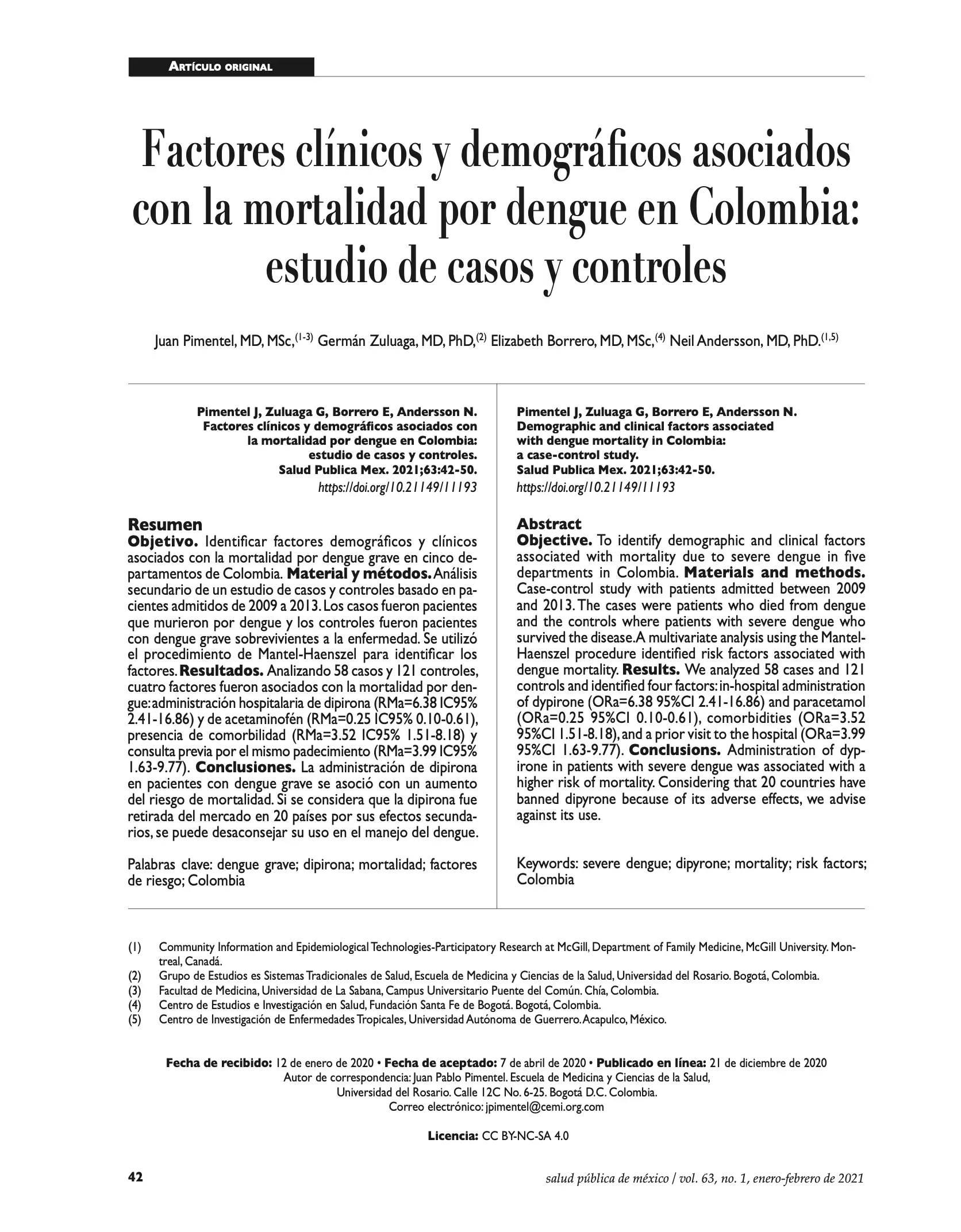 Factores clínicos y demográficos asociados con la mortalidad por dengue en Colombia: estudio de casos y controles