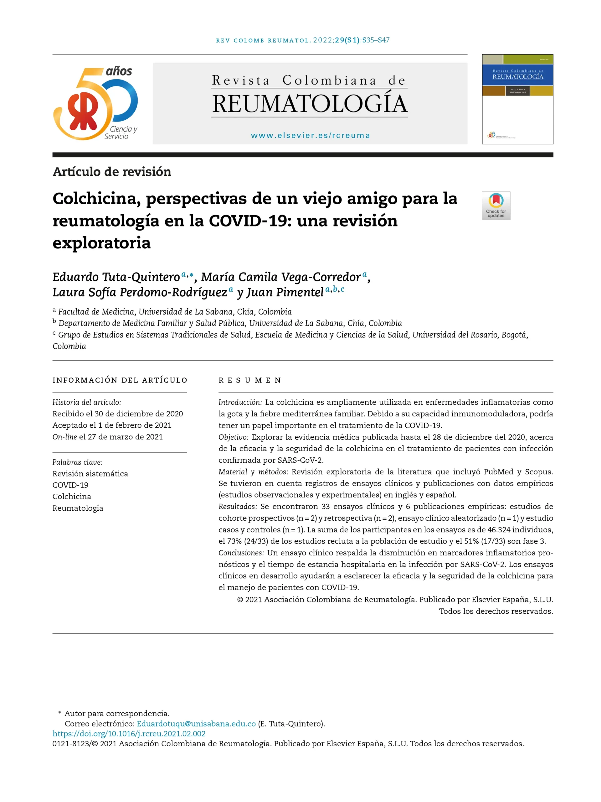 Colchicina, perspectivas de un viejo amigo para la reumatología en la COVID-19: una revisión exploratoria