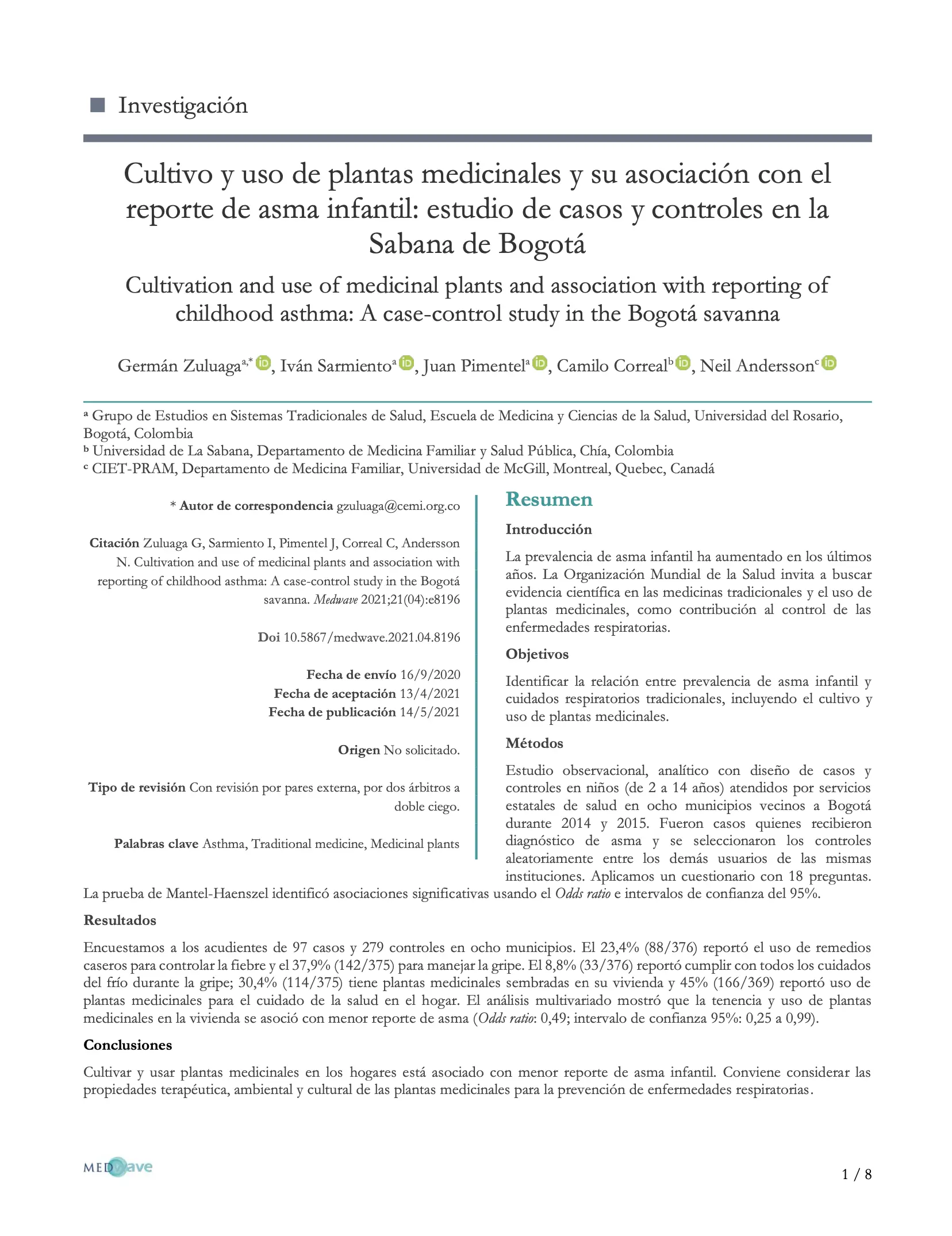 Cultivo y uso de plantas medicinales y su asociación con el reporte de asma infantil: estudio de casos y controles en la Sabana de Bogotá