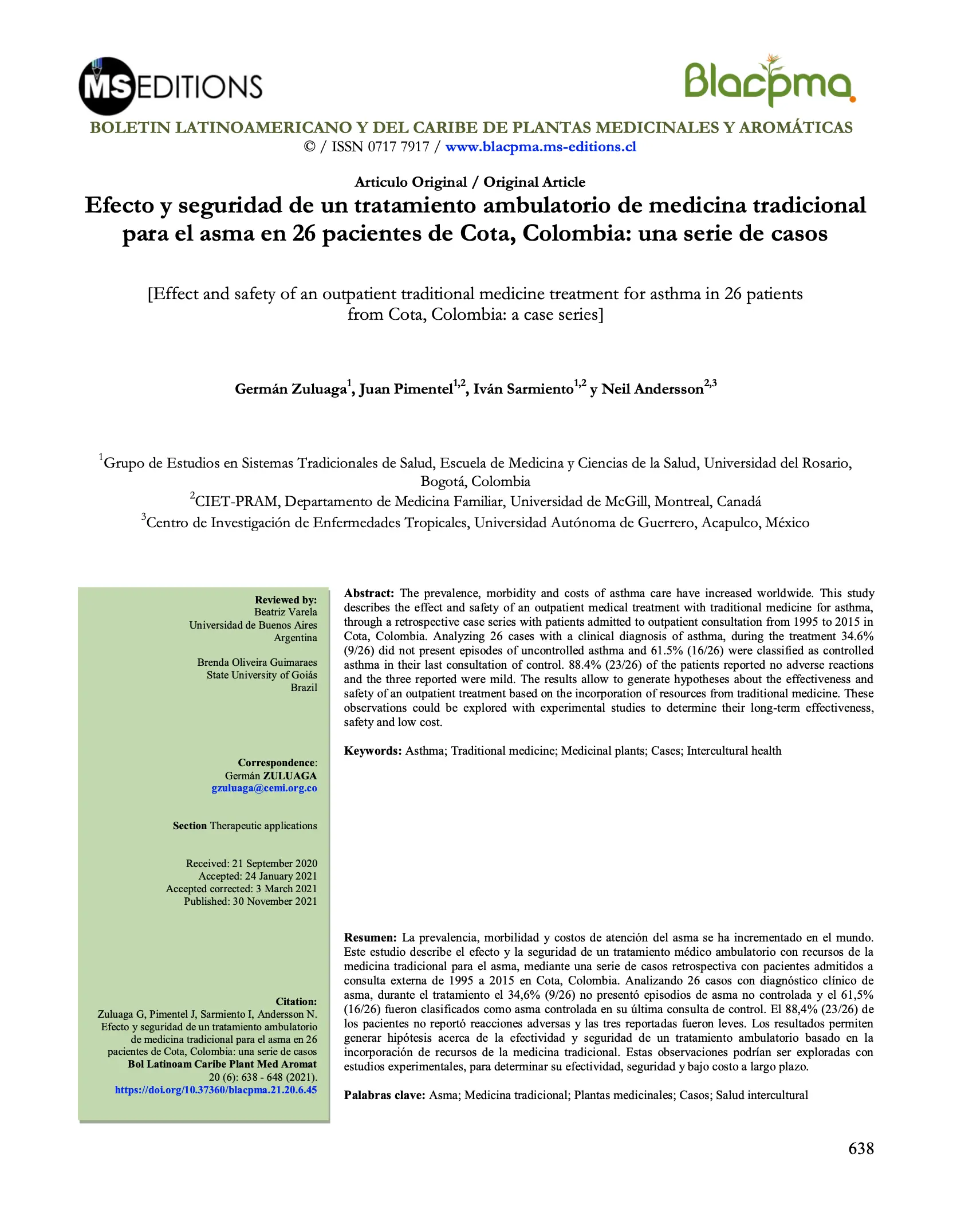 Efecto y seguridad de un tratamiento ambulatorio de medicina tradicional para el asma en 26 pacientes de Cota, Colombia: una serie de casos