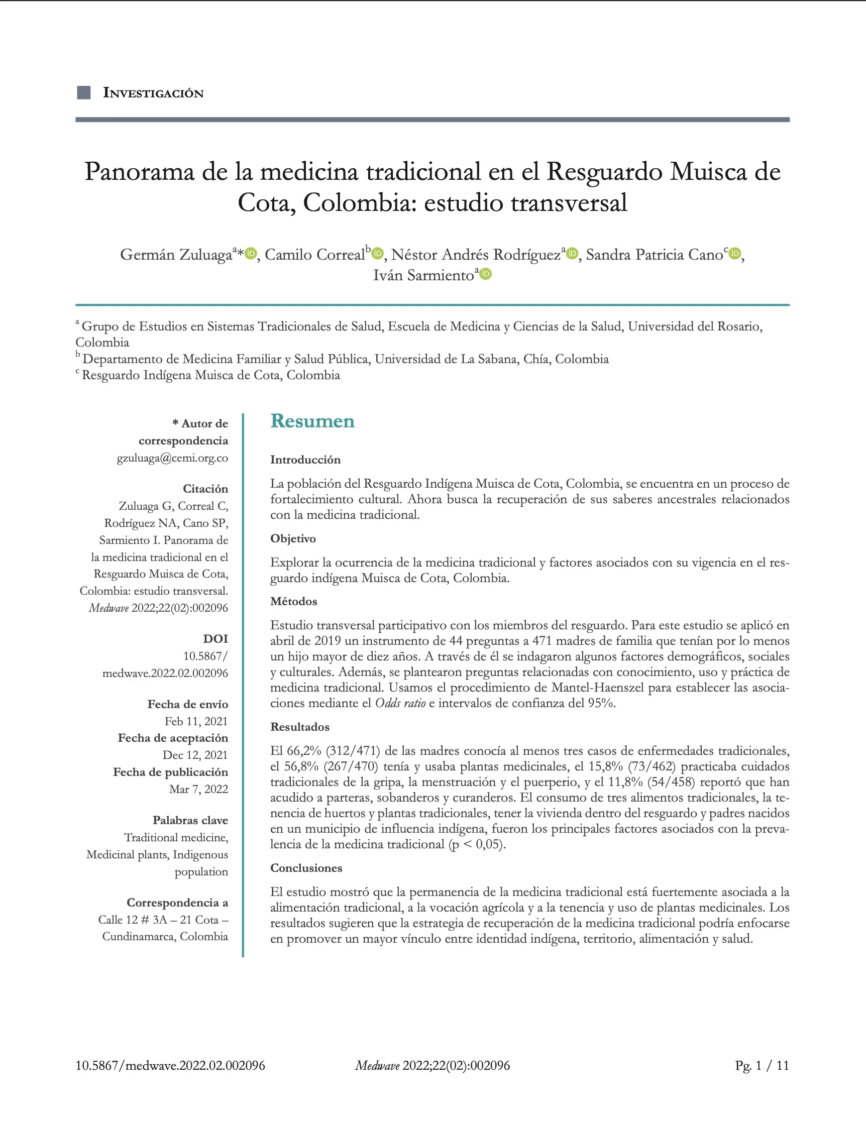 Panorama de la medicina tradicional en el Resguardo Muisca de Cota, Colombia: un estudio transversal